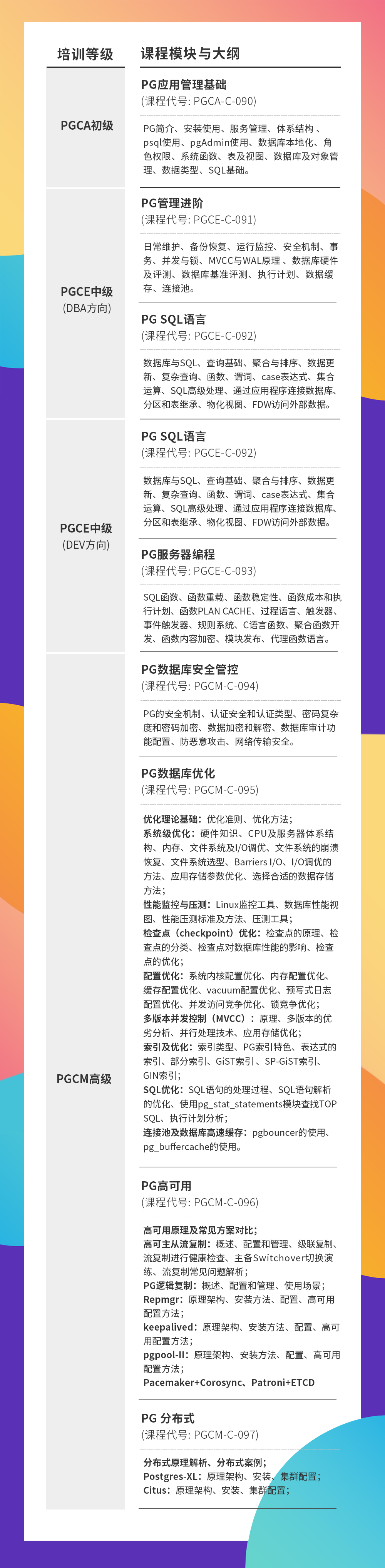 PGCM是PG最高级别认证,主要面向数据库安全管控;数据库诊断调优;数据库高可用、负载均衡、分布式、产品生态等内容。
